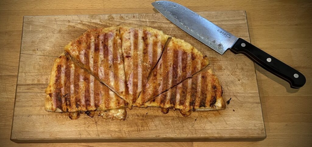 Man kann natürlich den Belag nach eigenen Wünschen gestalten. Zum Backen falte ich ein Blatt Backpapier und lege die Pizza dazwischen. So bleibt der Grill sauber und der Käse klebt nicht am Deckel.