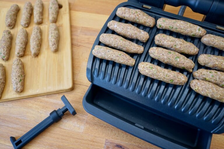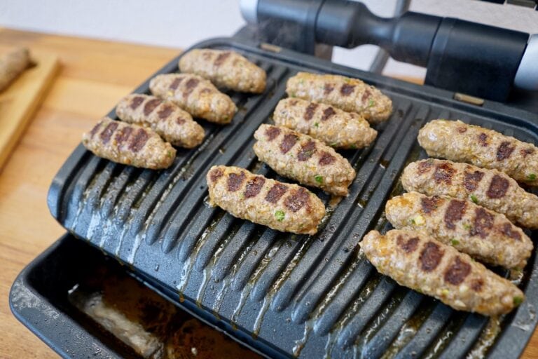 - Die ersten 12 Ćevapčići auf dem Grill verteilen, Abstandshalter montieren und Deckel darauf ablegen. Kurz nachsehen, ob der Deckel die Ćevapčići leicht berührt. Falls nicht, den Abstandshalter nochmal nachjustieren. Wenn du keinen Abstandshalter benutzt, schließe den Deckel vorsichtig.