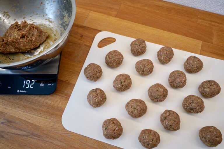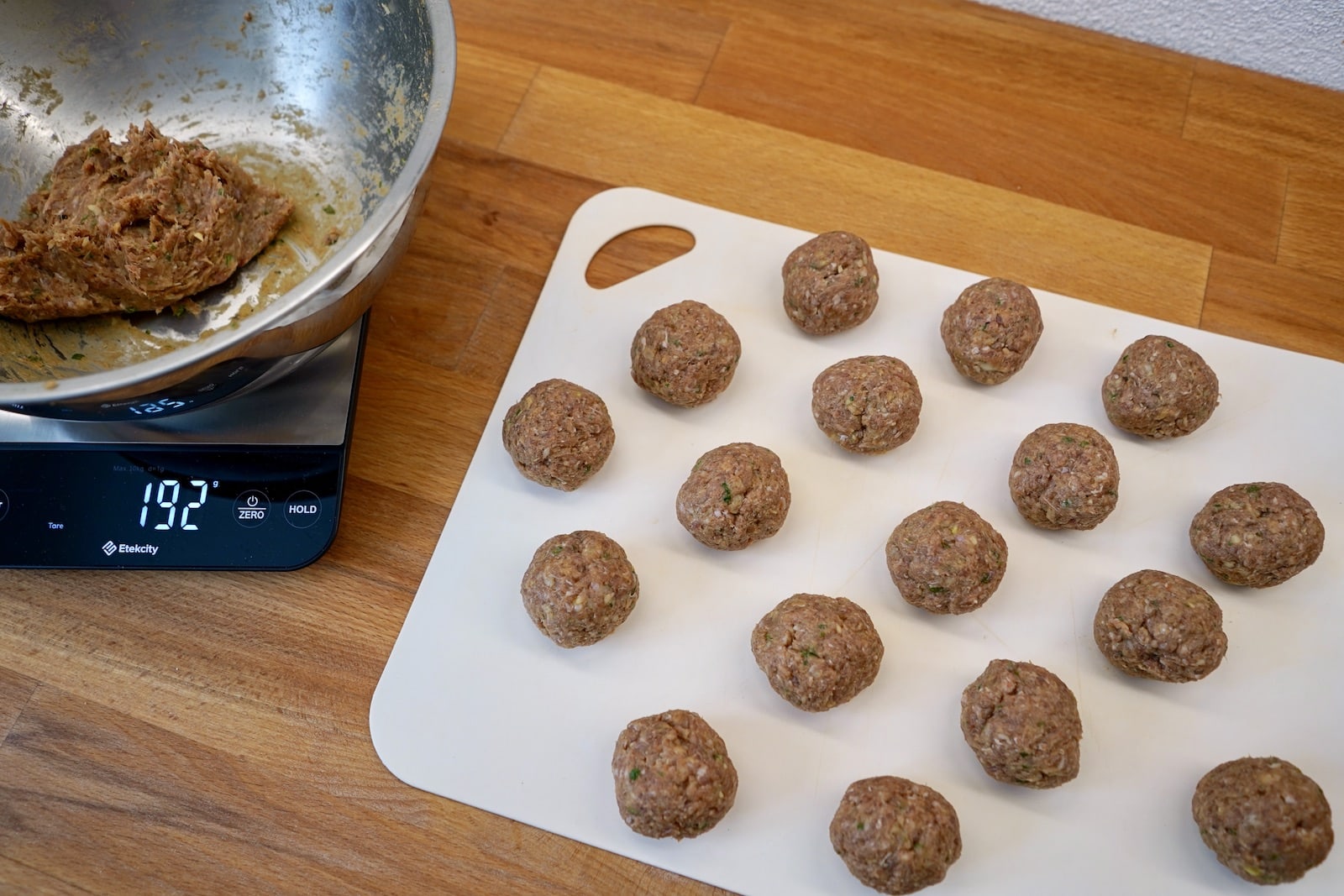 - Aus der Fleischmasse 20-25 Bällchen (à ca. 40 g) formen.