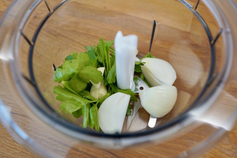- Zwiebel und Knoblauch schälen und in grobe Stücke schneiden. Petersilie waschen und Blätter abzupfen. Alles in einen Zerkleinerer geben und fein hacken.