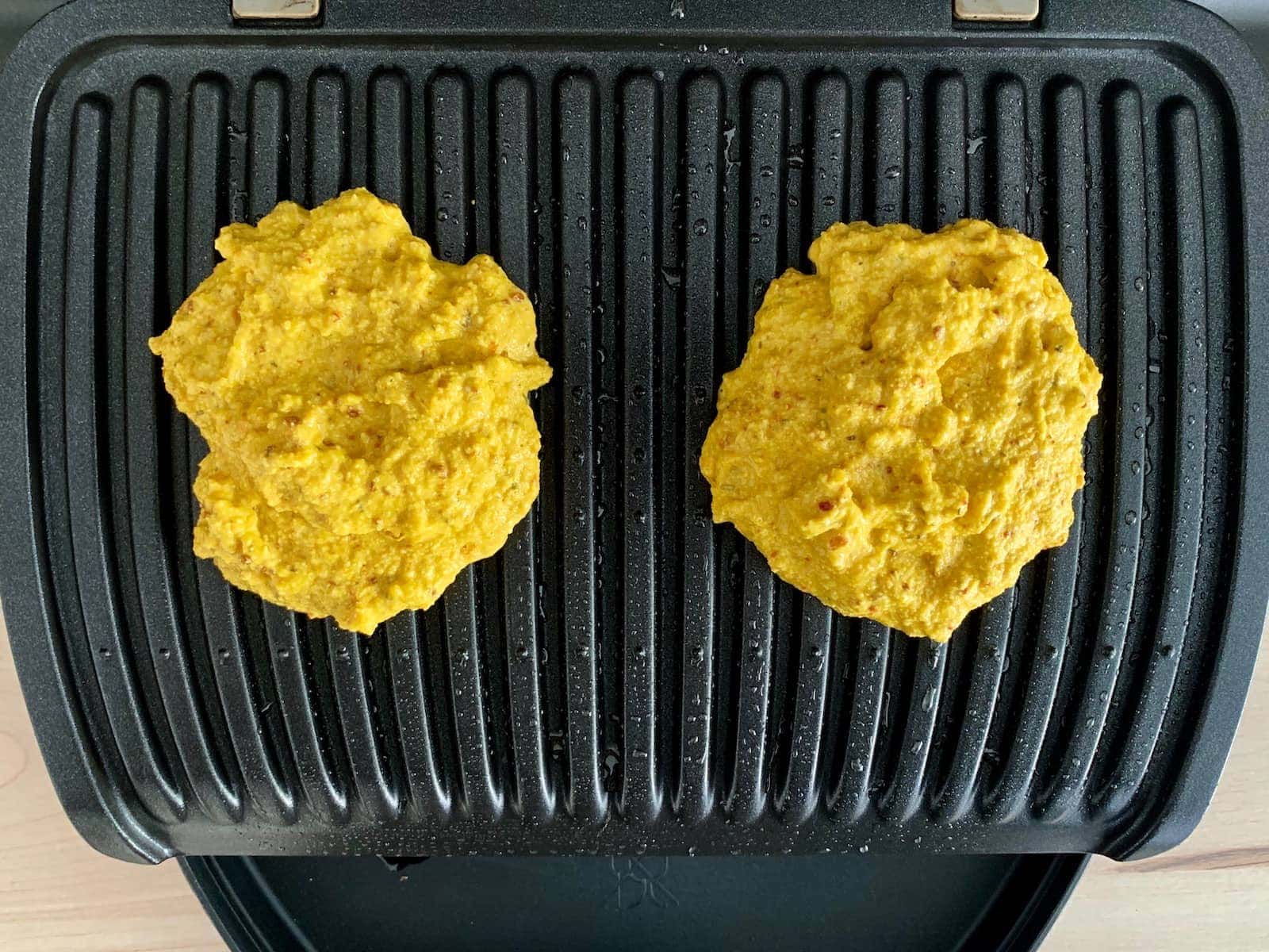 - Für große Taler jeweils zwei Esslöffel der Falafel-Mischung auf den Grill geben. Für kleine Taler kannst du vier einzelne Löffel nehmen – achte aber auf genug Abstand zwischen dem Teig. Die Oberseite der Falafel nun noch mit etwas Öl besprühen, damit nichts kleben bleibt. Alternativ kannst du auch die obere Grillplatte mit Öl bepinseln.