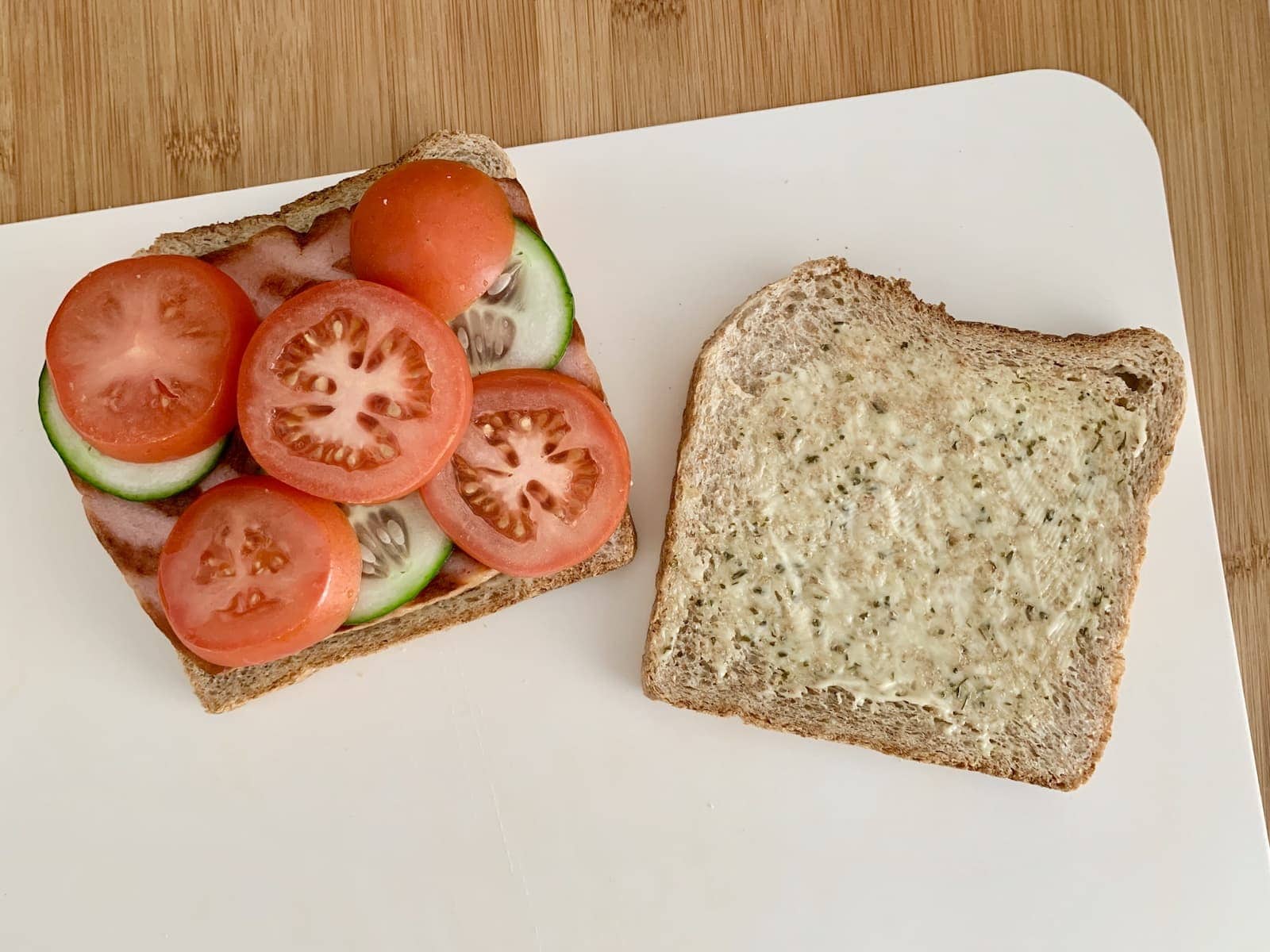 - Jeweils eine Scheibe des gegrillten Fleischkäse darauf legen. Mit Salatgurke und Tomate garnieren, Toastscheibe drauf legen.