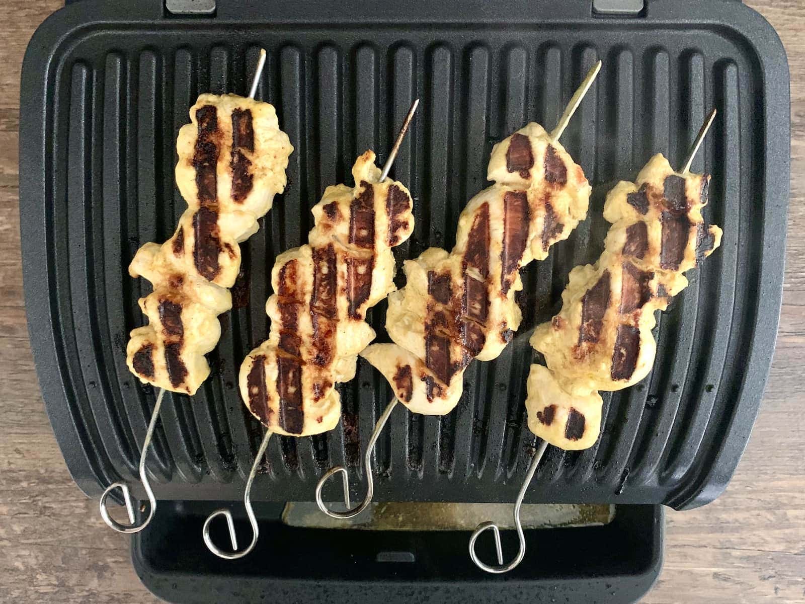 - Sobald der OptiGrill aufgeheizt ist, die Hähnchen-Spieße auf den Grill geben und den Deckel schließen.