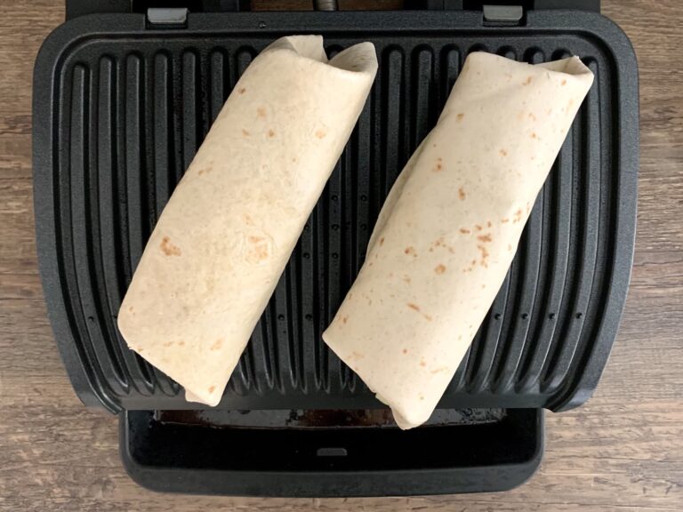- Sobald der OptiGrill wieder aufgeheizt ist, die Tortillas an den Seiten einschlagen und aufrollen. Mit der Falz nach unten auf den Grill legen, Deckel schließen und für fünf Minuten grillen.