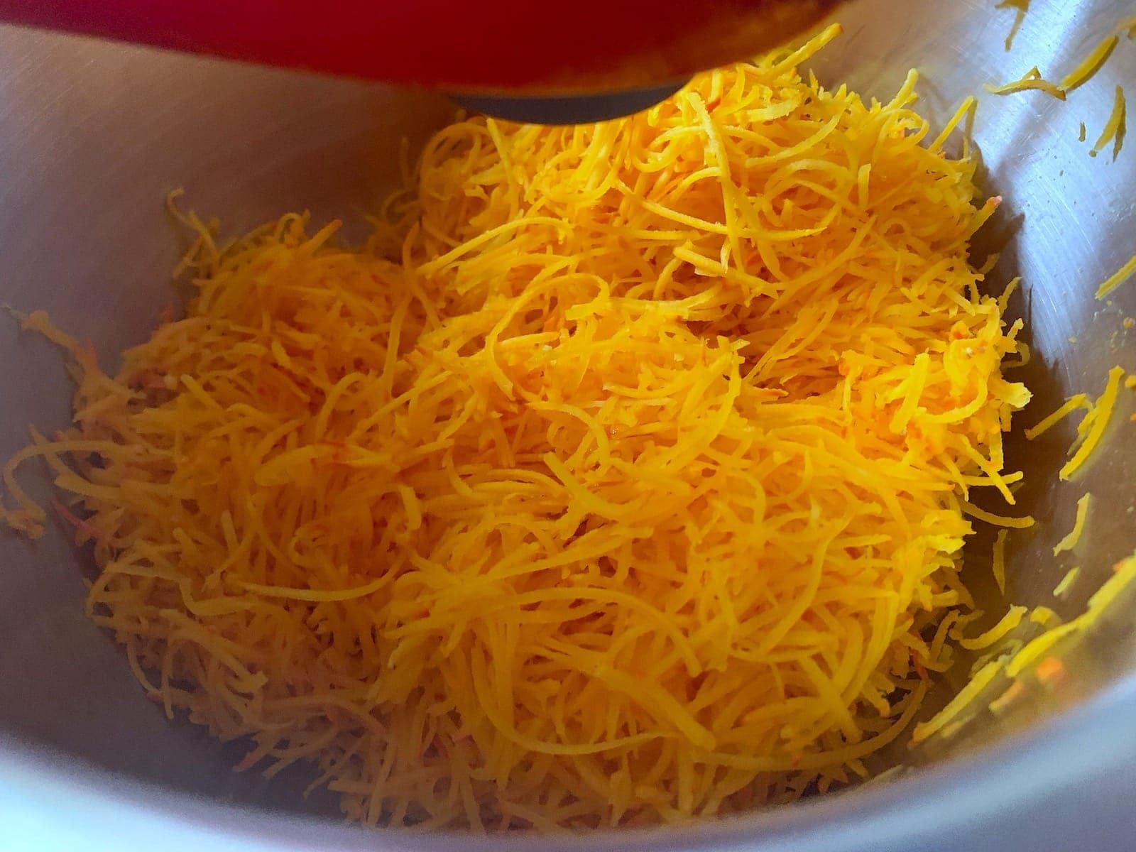 - Kürbis waschen und halbieren. Den halben Kürbis entkernen und mit einer Gemüsereibe oder in der Küchenmaschine fein reiben.
