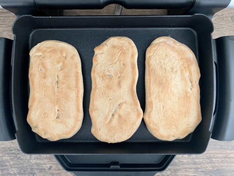 - Sobald der OptiGrill aufgeheizt ist, drei Stücke Teig mit etwas Abstand zueinander in die Backschale legen und für ca. 20 Minuten backen.