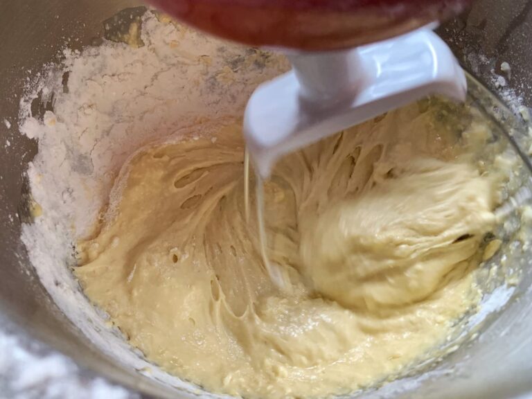 - Mehl mit dem Backpulver vermischen und zusammen mit dem Mineralwasser unter den Teig rühren.