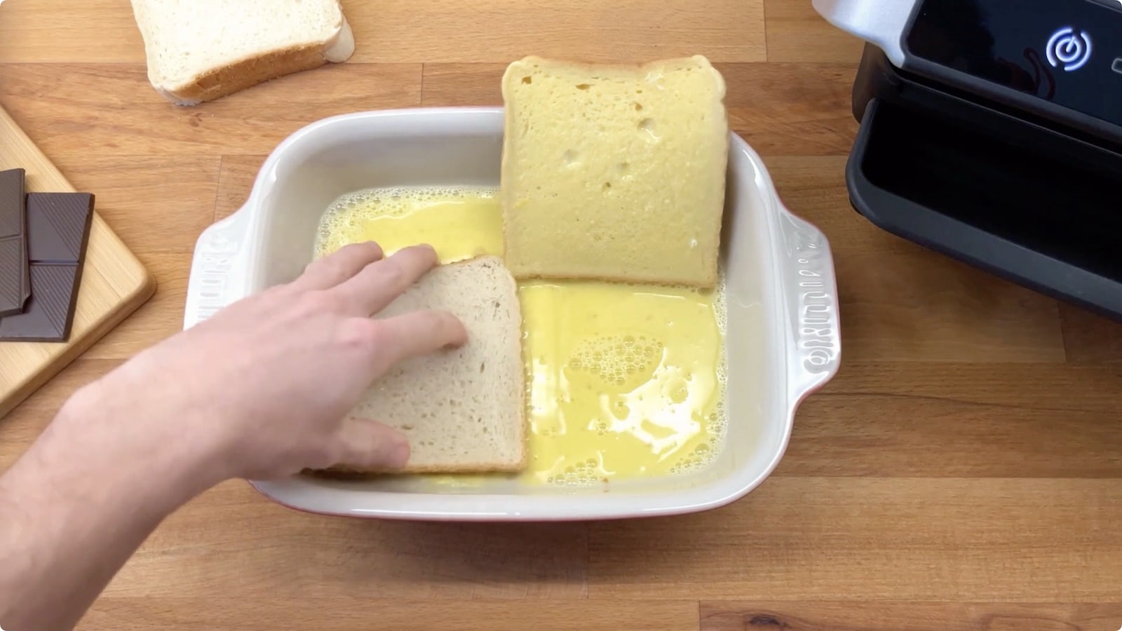 - Sobald der OptiGrill aufgeheizt ist, lege zwei Toast-Scheiben nebeneinander auf den Grill. Teile die Schokolade in zwei Stücke und lege sie jeweils mittig auf die Toast-Scheiben.