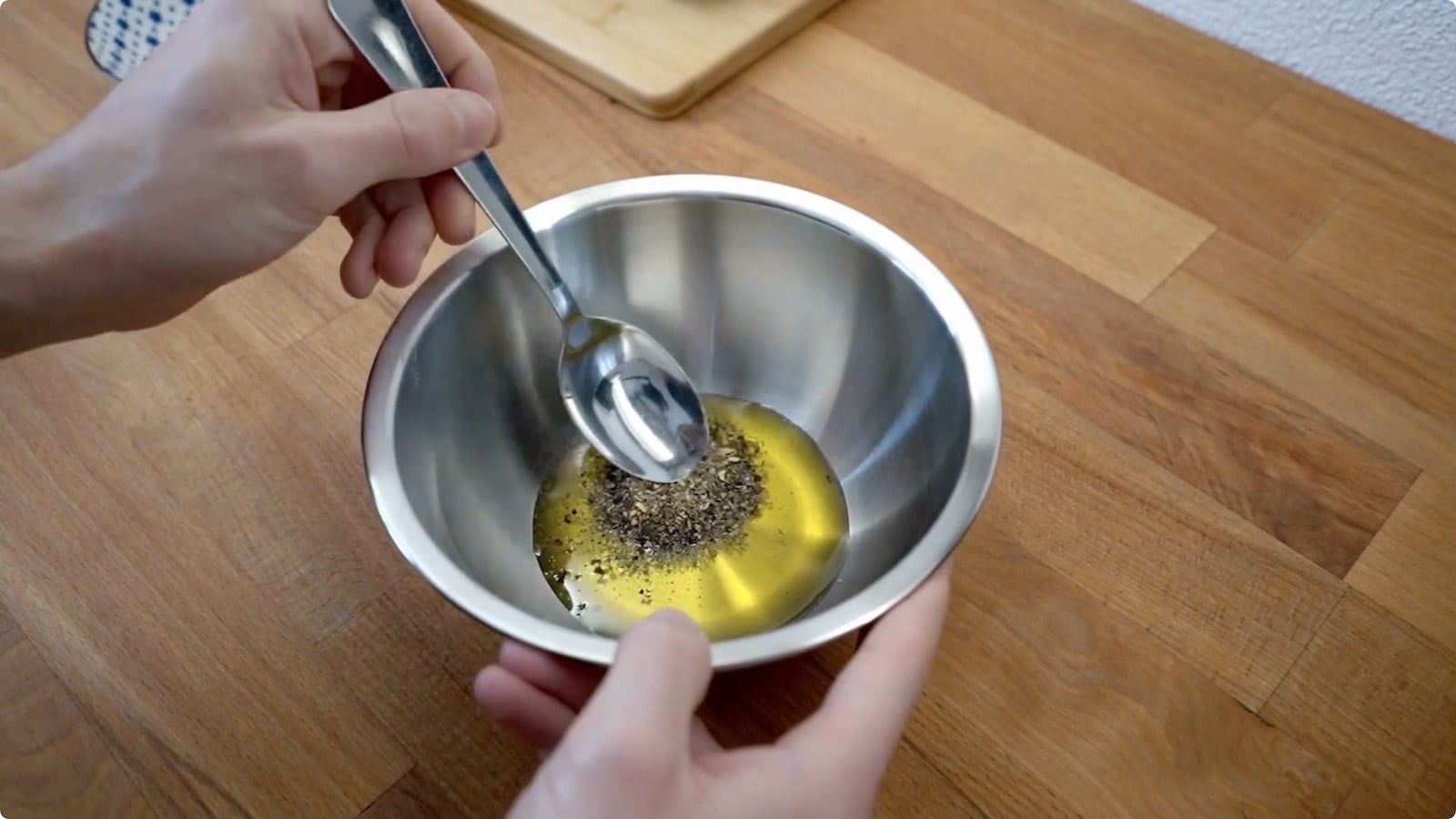 - Verrühre in einer Schüssel Olivenöl mit der Gewürzmischung, Salz und Pfeffer.