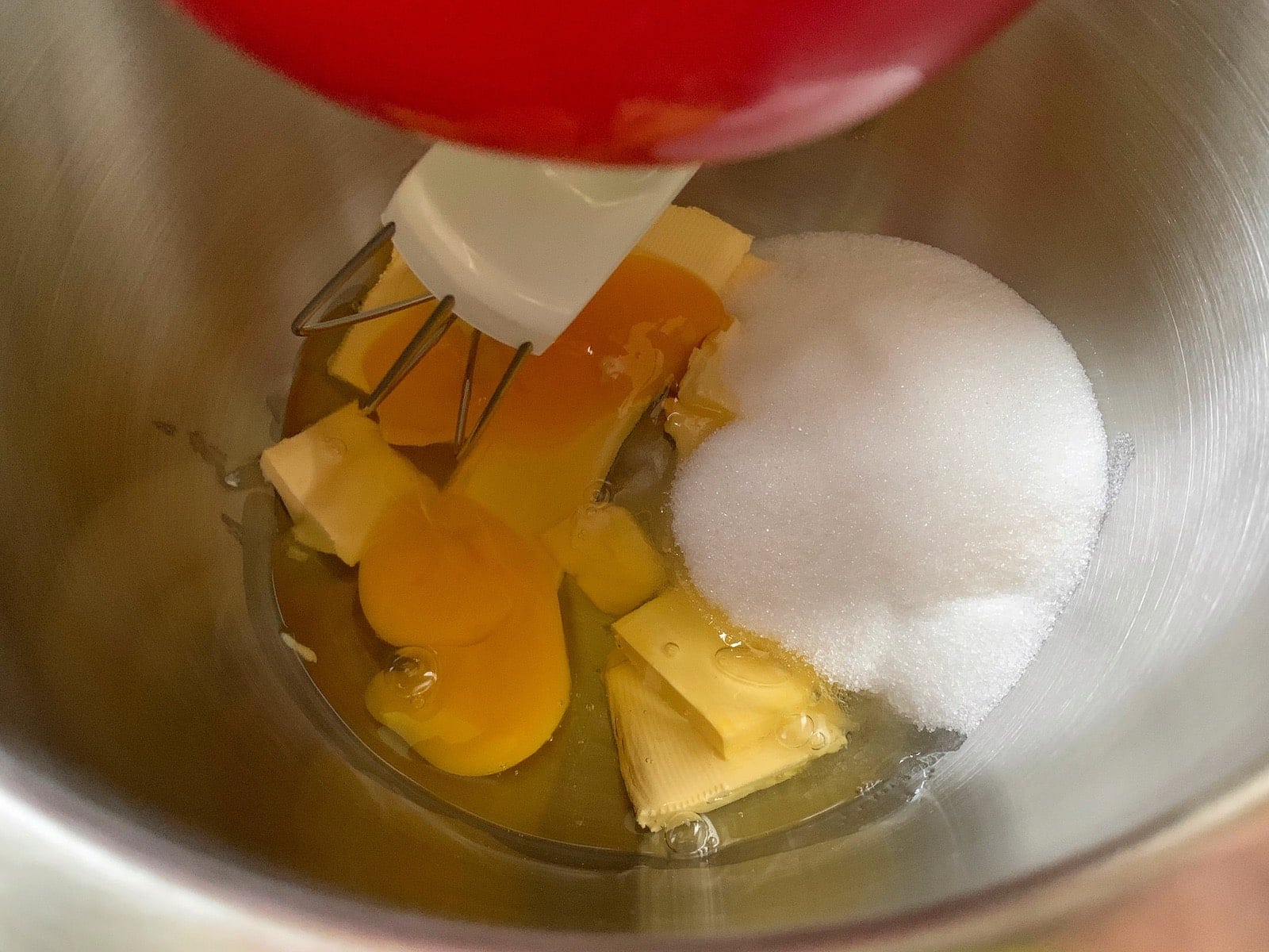 - Butter, Eier, Zucker und Vanillezucker in der Küchenmaschine oder mit einem Handrührer schaumig schlagen.